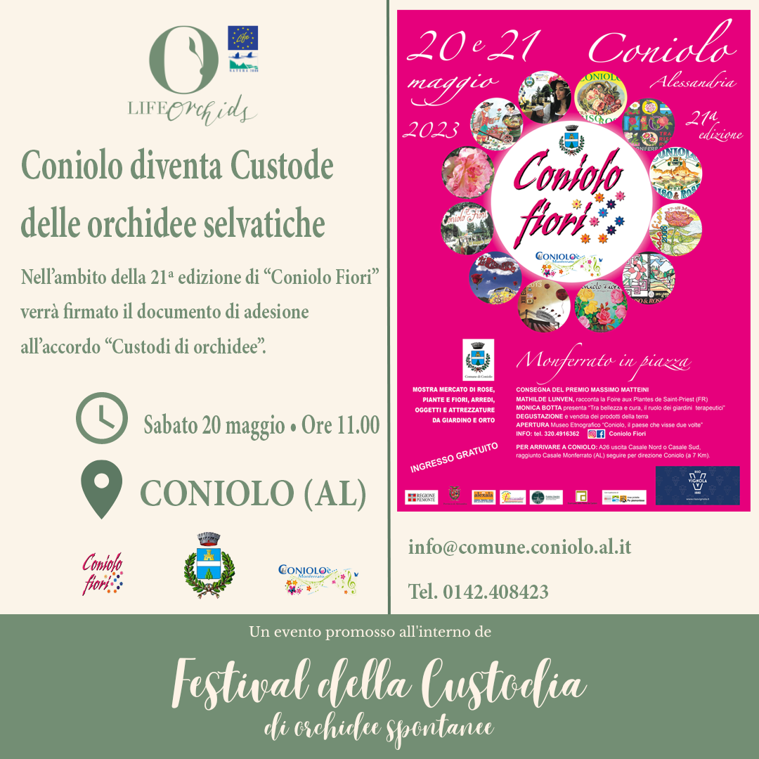 In occasione dell'inaugurazione della manifestazione "Coniolo Fiori" sabato 20 maggio alle ore 11:00 verrà firmato dal nostro Sindaco l'accordo con Legambiente per diventare Comune Custode di Orchidee selvatiche.