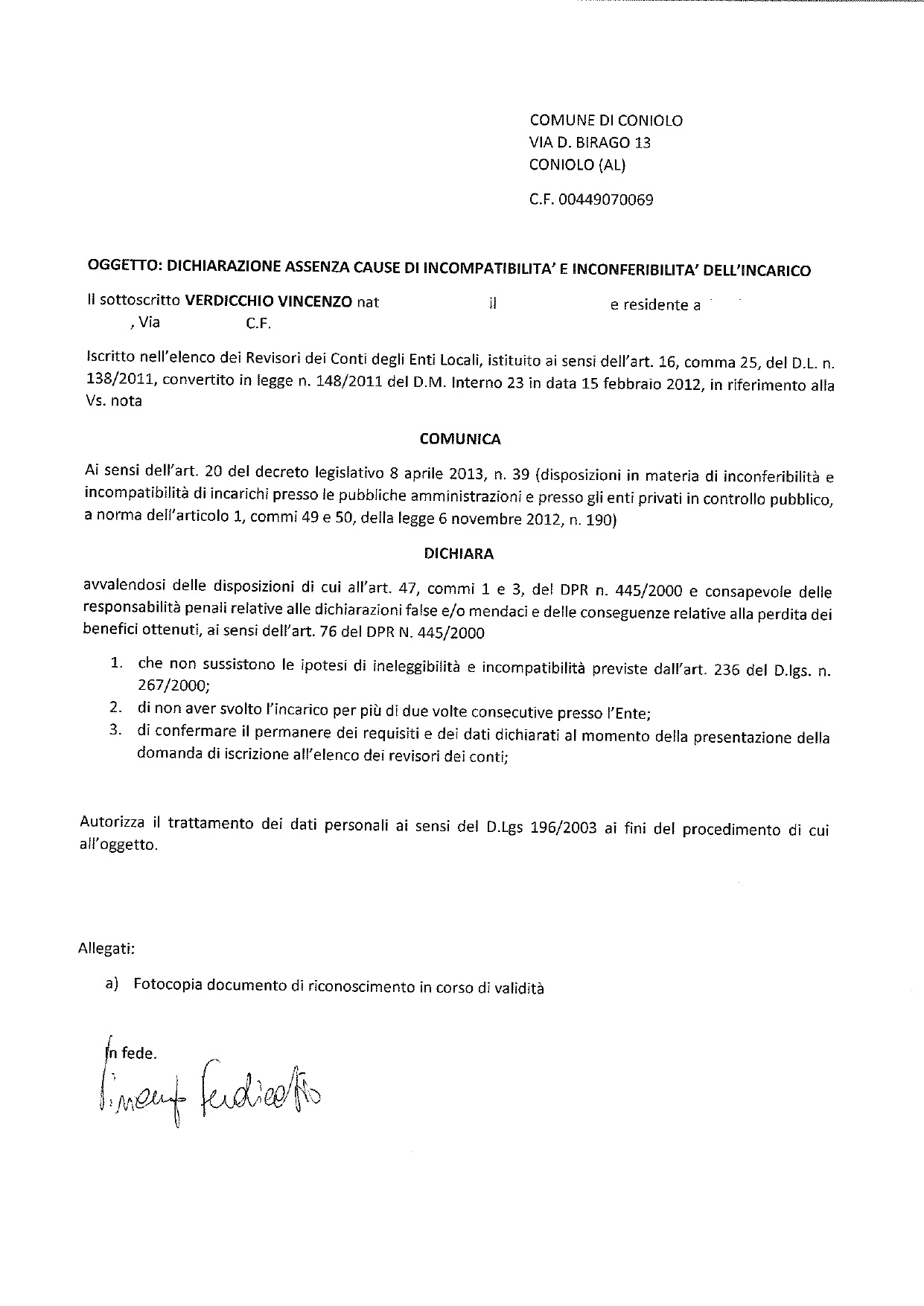 | Titolare d'incarico | Studio Vincenzo Verdicchio |